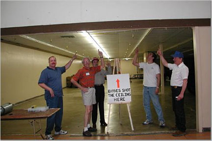 Shooting the ceiling in Little Rock: Gary Barnes has a picture on his website, Barnespneumatic, of a prank pulled on him at Little Rock. I am one, amongst many, in the photo who knows he shot the ceiling. Gary says it wasn’t him. (It’s always somebody else’s fault.) He says another person shot the ceiling, with his gun. He designed a gun without a trigger guard and he was handing it, loaded and cocked, to an inexperienced person. This is an even worse case of gun handling safety. So it’s either: Gary had an accidental discharge because he built a gun without a trigger guard or he made an even bigger mistake in gun handling safety, as he tells the story. This photo is obscure on the net. The place it is found is on Gary’s website. Why he keeps it there is a puzzle because it’s an embarrassment for him either way the story is told.