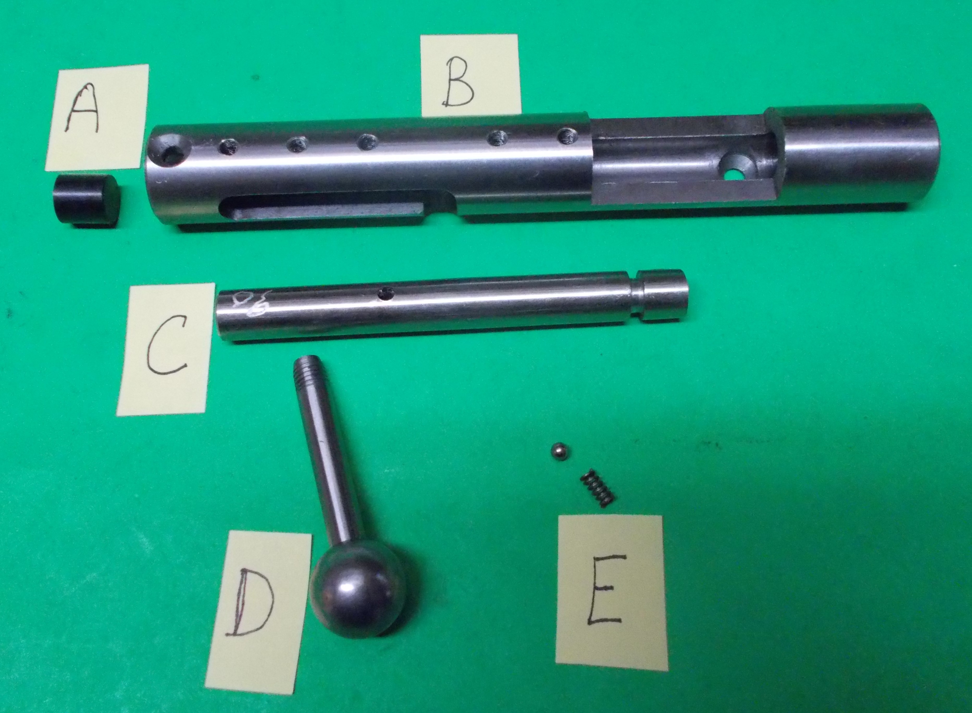 A: Breach plug B: Breach C: Breech bolt D:Bolt handle E: Bolt detent ball & spring