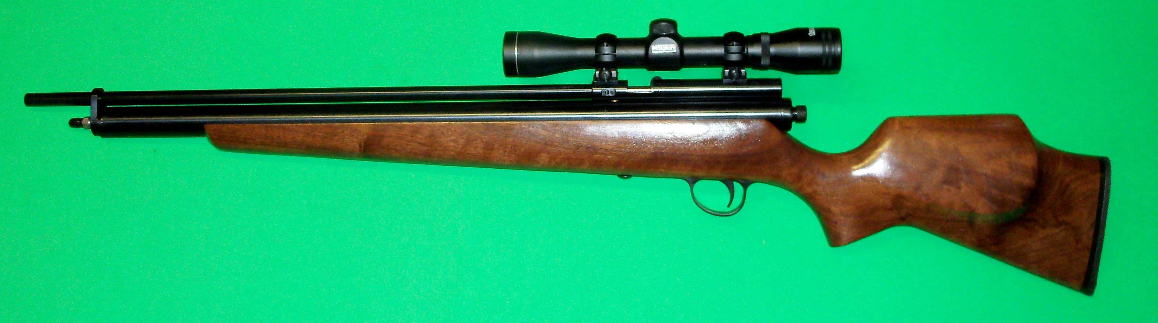 The following 2 rifles are "short" rifles. They have 20" barrels and a shortened reservoir tube to match. I first started making short rifles 5 years ago by request from Texas hunters. They needed a rifle short enough to swing around in a pickup truck without taking the windscreen out.